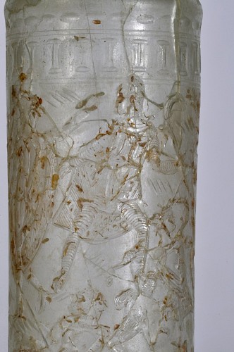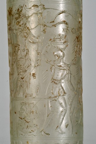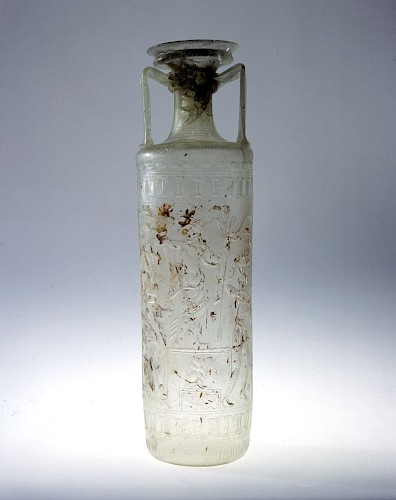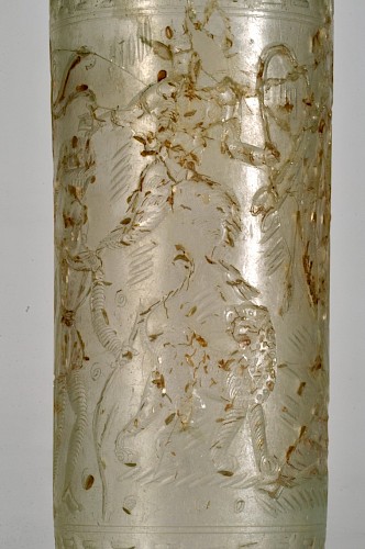 Das Landesmuseum Mainz besitzt eine bedeutende Sammlung römischer Gläser. Zurzeit ist davon nur das wertvollste Stück – die sogenannte Dionysosflasche aus Hohen-Sülzen, Landkreis Alzey-Worms - im Schau!Depot ausgestellt. Das Glas wurde 1869 zusammen mit drei anderen, heute verschollenen Gläsern, darunter die berühmte Schale mit Netzüberfang (Diatret), in einem Sandsteinsarkophag gefunden. Nicht nur seine ungewöhnliche Größe (H. 42 (!) cm) macht das hellgrüne doppelhenkelige Glas bedeutsam; es gehört auch zu den seltenen Zylinderflaschen mit figürlichem Schliffdekor. Dargestellt ist auf einem Podest stehend der Weingott Dionysos, flankiert von Figuren seines Gefolges (Pan, Satyr, Mänade) und seinem Begleittier, dem Panther. Durch den tiefen Hohlschliff und die zusätzliche feine Binnengravur wirken die Figuren sehr plastisch. Noch ist in der Forschung umstritten, ob das Glas im 3. Jahrhundert in einer Kölner oder in einer ostmediterranen Werkstatt hergestellt wurde.