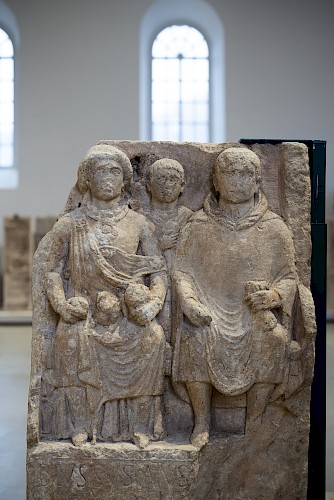 Der Grabstein des einheimischen Schiffers Blussus und seiner Frau Menimane ist durch seine einzigartige beidseitige Verzierung der wohl bekannteste Grabstein in der römischen Steinsammlung des Landesmuseums Mainz. Die Vorderseite zeigt in Frontalansicht Blussus und Menimane auf einer Bank. Hinter dem Ehepaar ist ein junger Mann erkennbar, bei dem es sich wahrscheinlich um den Sohn Primus oder um den Haussklaven Satto handelt. Letzterer ist, wie uns die Inschrift mitteilt, an selber Stelle beigesetzt worden.